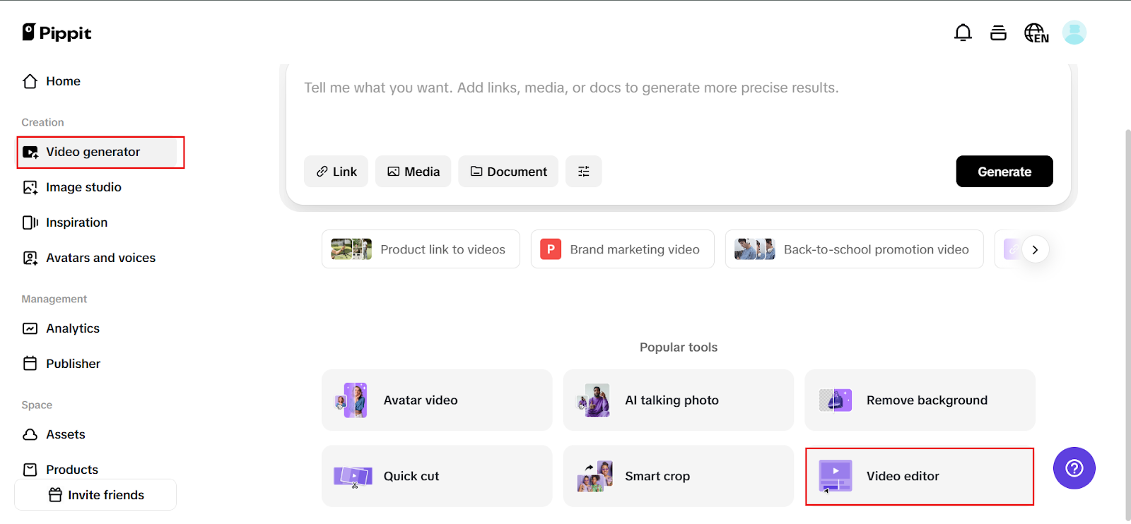 Start by logging in to your Pippit account and heading to the ‘Video generator‘ section. Click on the ‘Video editor‘ option this opens up your editing workspace with everything you need. Whether you’re working on your first single or a freestyle rap clip, this sets the stage for seamless lyric generation.