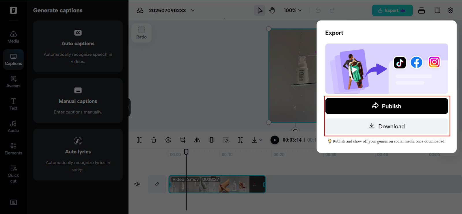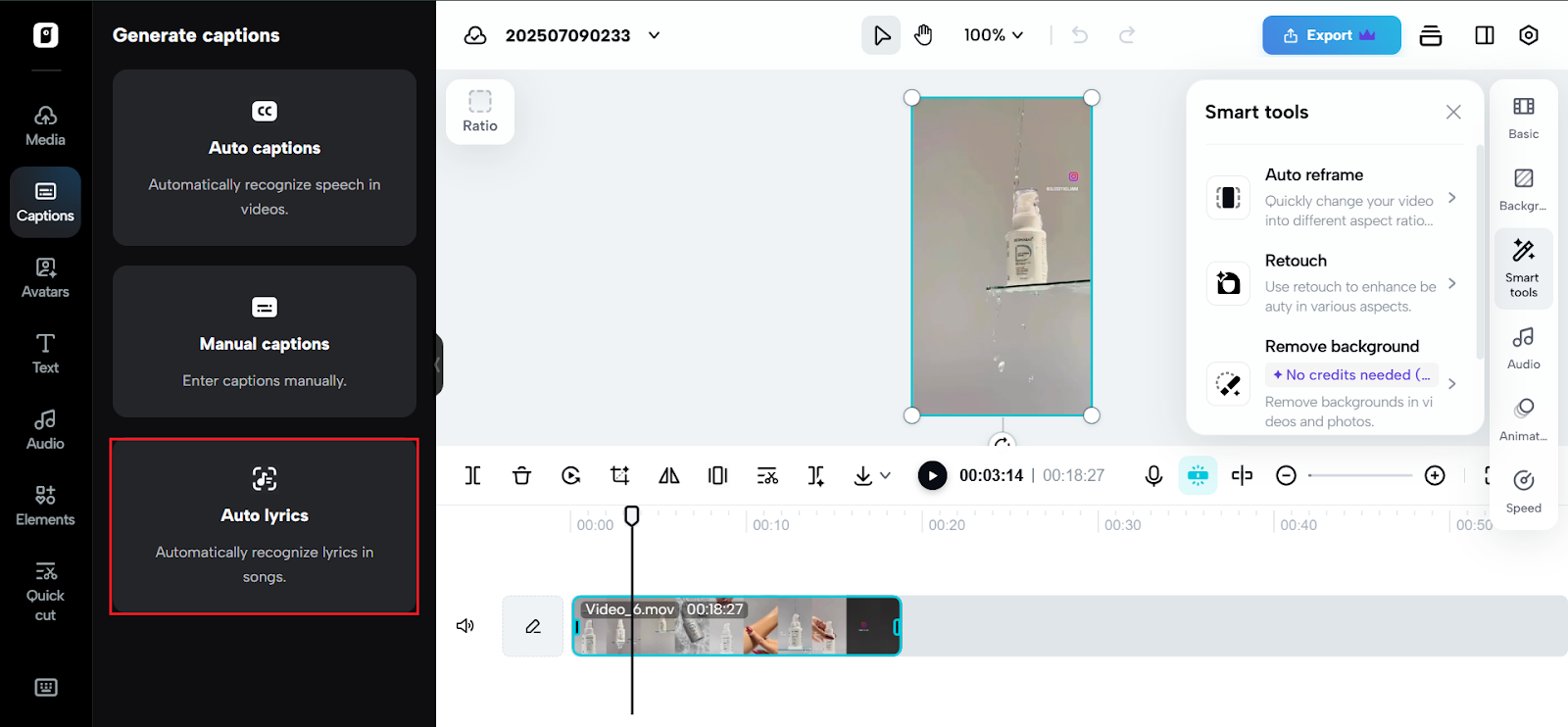 Now the fun part: from the left panel, navigate to Captions and click ‘Auto Lyrics‘. Pippit’s AI does the heavy lifting by analysing your audio and creating synced lyrics automatically.